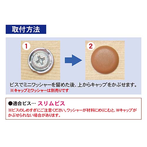 ちょっと気になるビスの穴隠しや、フリー板、家具造りなどの取付ビスに。 本商品はビスキャップ単体での販売となっております。 別売りのミニワッシャーと併用してご使用ください。 ※表示価格は税込価格となります。 (税率10%) 【生産国】中国 皿ビス/スリムビス用