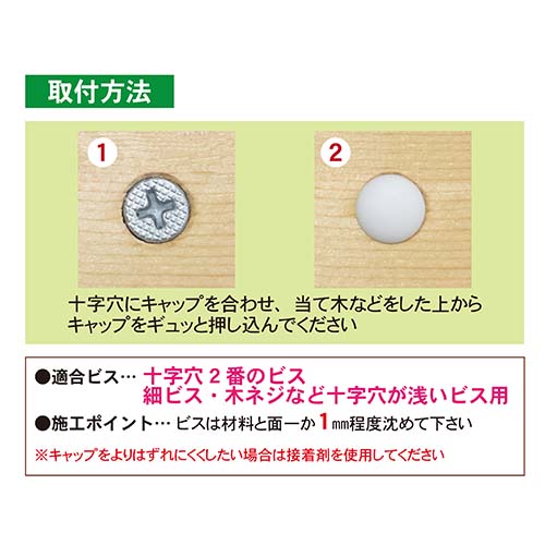 細ビスや木ネジなど、十字穴が浅いビス用です。 ※表示価格は税込価格となります。 (税率10%) ※3,000個以上お買い上げの場合はお問い合わせフォームからご連絡下さい。 【生産国】中国 十字穴2番専用 ご注意 ・ビスは材料と面一か1mm程度沈めてください ・キャップをより外れにくくしたい場合は接着剤を使用してください