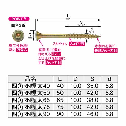 施工性抜群の四角穴仕様! 合板、根太、垂木の施工に安心の極太ビスです。 ※施工には「四角3番ビット」をご使用ください。 各サイズ入数 ・四角RN極太40 109本入り ・四角RN極太50 93本入り ・四角RN極太65 68本入り ・四角RN極太75 62本入り ・四角RN極太90 53本入り