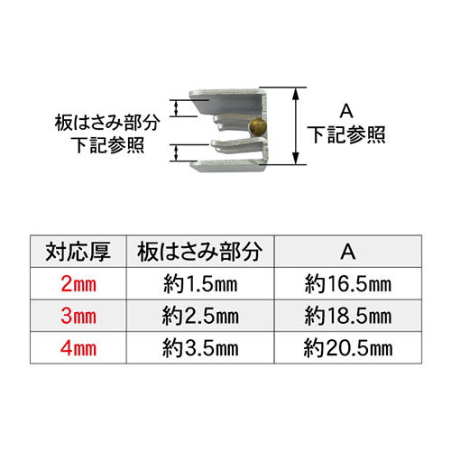 お好きなサイズのアクリル板に蝶番をはさむだけ!付属品のみで簡単取付! 折り曲げ可能なので隙間収納や角度の微調整が圧倒的便利なアクリルパーテーション用蝶番です。 ※本製品は「コの字型」前提のため、平ら(180度)には開きません 【対応アクリル厚】 2mm用/3mm用/4mm用 全3タイプ 【商品入数】 蝶番本体 4個 (付属品) イモネジ 8個 六角レンチ 1本 ※アクリル板は付属いたしません。