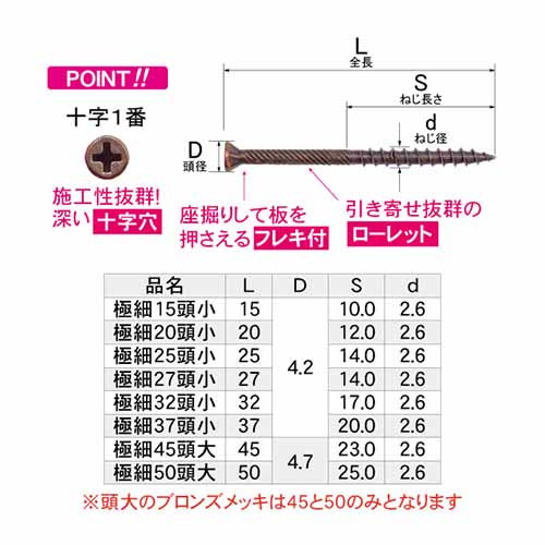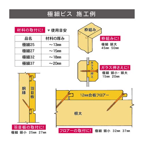 【製品特徴】 ・施工性抜群の深い十字穴 ・座掘りして板を押さえるフレキ付き ・引き寄せ抜群のローレット 【施工例】 ・ガラス押さえ 極細15~20 ・枠組み 極細45~50 ・羽目板 極細25~32 など 【各サイズ入数】 ・極細15頭小 766本入り ・極細20頭小 570本入り ・極細25頭小 474本入り ・極細27頭小 417本入り ・極細32頭小 358本入り ・極細37頭小 324本入り ・極細45頭大 270本入り ・極細50頭大 243本入り