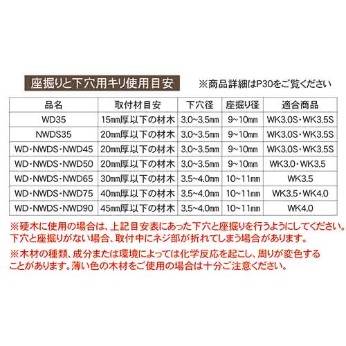 ※硬木に使用の場合は、目安表にあった下穴と座掘りを行うようにしてください。下穴と座掘りが無い場合、取り付け中にネジ部が折れてしまう場合があります。