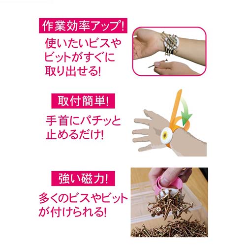 手首にパチッと留めるだけ! 幅広い場面で大活躍。ビスや針などを手元にキープできる便利アイテム! 強力磁石が多くのビスやビットをしっかり吸着。使いたいビスやビットを手元にキープできるので作業効率大幅アップ間違いなし!